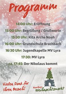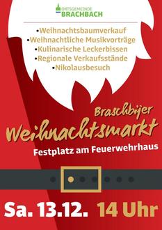 Am dritten Adventssamstag, 13. Dezember 2025, findet rund um den Festplatz am Feuerwehrhaus der 13. Brachbacher Weihnachtsmarkt statt. Von 14:00 bis 21:00 Uhr erwartet die Besucherinnen und Besucher ein vielfältiges Programm mit kulinarischen Angeboten, handwerklichen Erzeugnissen und musikalischer Unterhaltung. Der Weihnachtsmarkt bietet Gelegenheit, sich bei Glühwein, Crêpes, Currywurst und anderen weihnachtlichen Spezialitäten auf die Feiertage einzustimmen.