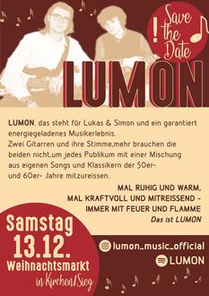 Die besinnliche Atmosphäre wird durch kulinarische Angebote und Musik ergänzt: Der Duft von Glühwein und frisch gebackenen Waffeln liegt in der Luft, während ein abwechslungsreiches Live-Programm mit Gesang, Instrumentalmusik und Lichtshow für stimmungsvolle Momente sorgt. Die Kleineren können sich auf die Kindereisenbahn und den Besuch des Nikolaus freuen. Am Abend sorgt die Band „LUMON“ mit Lukas & Simon für ein energiegeladenes Musikerlebnis mit einer Mischung aus eigenen Songs und Klassikern der 50er- und 60er-Jahre.