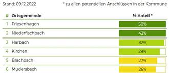 Aktuell (Stand: 09. Dezember 2022) haben 31 der 50 Kommunen im Landkreis Altenkirchen die von der Deutschen Glasfaser festgelegte Quote von 33% erreicht.