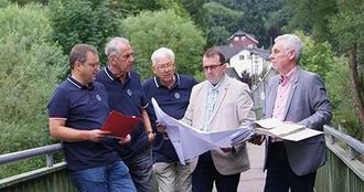 Foto aus 2017 (von rechts): Stadtbürgermeister Berno Neuhoff, die Beigeordneten der Stadt mit dem damaligen Bauamtsleiter Karl-Heinz Henn. Der Haushaltsplan der Stadt Wissen für 2023 und damit wichtige Investitionen wurden vertagt (Bericht oben). Ein Projekt ist zum Beispiel der Ersatzneubau für die marode Heubrücke im Stadtteil Schönstein, die dem überregionalen Radweg Sieg und Westerwald-Lahn-Radweg dienen soll. Ohne den Zuschuss könnte die Stadt die Brücke niemals bauen. Sie müsste abgerissen werden und der Radweg bliebe auf Dauer unvollendet. Im Herbst letzten Jahres hatte Wissen dafür einen Förderbescheid von 90 Prozent für die Baukosten in Höhe von rund zwei Millionen Euro erhalten. Möglich wird der Bau der Heubrücke nur, wenn der Haushalt 2023 zustande kommt und genehmigt wird. Bereits 2017 hatte man fertige Pläne entwickelt und es wurde vom Bund/Land erstmals ein hoher Zuschuss in Aussicht gestellt . Nun könnte man die Brücke nach jahrelangem Warten endlich realisieren. Aber der neue Finanzausgleich des Landes bereitet der Stadt Wissen große Probleme. Die Stadt hat also alle ihre Hausaufgaben für den Bau gemacht. Es liegt nun am Stadthaushalt 2023 und den Fachbehörden des Landes (Wasserbehörde, Naturschutzbehörde, Denkmalschutz) beim Ersatzneubau zeitnah „mitzuziehen“. Neben dem Stadtrat wird sich daher auch der Bauausschuss damit befassen müssen.