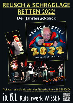 Die musik-kabarettistische Veranstaltung findet am Sonntag, den 15. Januar 2023 um 19:30 Uhr im kulturWERKwissen, Walzwerkstraße 22 in 57537 Wissen statt. Reservierte Sitzplätze an Bistrotischen sind im Vorverkauf für 20 Euro in allen Reservix-Vorverkaufsstellen, unter kulturwerk-wissen.de sowie bei der Ticket-Hotline 0180 60 50 400 (0,20 €/Anruf inkl. MwSt aus den Festnetzen, max. 0,60 €/Anruf inkl. MwSt aus den Mobilfunknetzen) erhältlich. Der Einlass und die Abendkasse sind ab 19 Uhr geöffnet. Veranstalter ist die kulturWERKwissen gGmbH in Kooperation mit der Wissener eigenART.