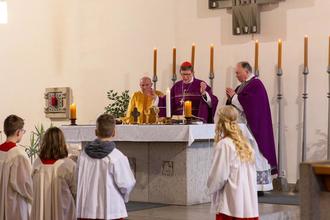 Etwa zwei Wochen nach der schweren Brandstiftung in der Wissener Kreuzerhöhungskirche hat Erzbischof Rainer Maria Kardinal Woelki am 26. Februar die Kirchengemeinde in Wissen besucht. Gemeinsam mit Kreisdechant Martin Kürten und dem ukrainischen Pfarrer Roman Kisil (Priester der Ukrainisch, Griechisch-Katholischen Kirche) feierte er in der Pfarrkirche St. Katharina in Wissen-Schönstein die Heilige Messe vom ersten Fastensonntag. Pfarrer Kürten erklärte in seiner Begrüßung, dass der Erzbischof sich noch am Tag des Brandes bei ihm gemeldet und sich nach dem Zustand der Kirche erkundigt habe. Dies zeige ihm, dass der Kardinal sich um jede Kirche und jede Gemeinde seines Bistums sorge.