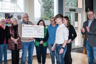 Abiturienten des Kopernikus-Gymnasium Wissen überreichen einen symbolischen Scheck über 2700 Euro an den Initiator des Café Kiew, Horst Pinhammer und Team