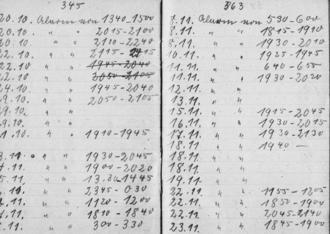 Zwischen Mai 1940 und März 1944 ertönten in Wissen 508 Mal die Alarmsirenen. Festgehalten hat dies die Wissenerin Martha Quast penibel handschriftlich auf 27 Seiten. Hier ein Beispiel aus dem bemerkenswerten Zeitdokument. Es umfasst den 20. Oktober bis zum 23. November 1943.