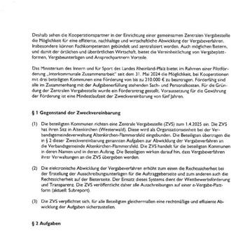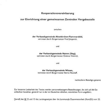 Die Verbandsgemeinderäte Altenkirchen-Flammersfeld (Beschluss vom 19.12.2024), Hamm (Sieg) –Beschluss vom 10.12.2024 - und Wissen (Beschluss vom 18.12.2024) haben gemäß den §§ 12 und 13 des Landesgesetzes über die Kommunale Zusammenarbeit (KomZG) eine Zweckvereinbarung über die Errichtung einer gemeinsamen Vergabestelle zwischen der Verbandsgemeinde Altenkirchen-Flammersfeld, der Verbandsgemeinde Hamm (Sieg) und der Verbandsgemeinde Wissen beschlossen.