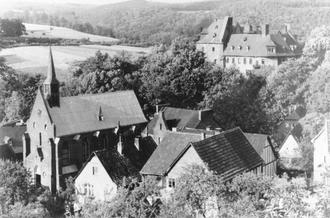 In Schönstein pflegte man vor langer Zeit den schönen Brauch des Osterklapperns. Zu sehen sind hier Kirche und Schule sowie das Schloss im Hintergrund auf einer Aufnahme von Alfons Reinstädtler aus den 1920er Jahren.
