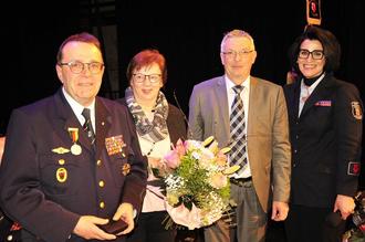 Bevor der Titel „Ein Leben lang“ erklang, wurde einem „Urgestein“ der Stadt- und Feuerwehrkapelle eine besondere Ehrung zuteil. Claus Behner und Ehefrau Ursula wurden von Alexandra Reifenrath auf die Bühne gebeten. Das Publikum honorierte die von Luisa Fischer aufgezeigten Leistungen des Jubilars, mit stehenden Ovationen. Uwe Fischer, stellvertretender Vorsitzender des Kreismusikverbandes, verlieh die Verdienstmedaille des Landesmusikverbandes an Claus Behner, der rund 40 Jahre im Vorstand des Vereins tätig war. Vom Verein erhielt Behner die Urkunde für 50-jährige Mitgliedschaft. Seine Ehefrau Ursula erhielt einen Blumengruß des Orchesters.