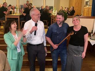 Die „Ära Becher“ geht nach sieben Generationen in der Gaststätte „Zur alten Kapelle in Birken-Honigsessen zu Ende. Die Nachfolger starten am 1. Mai. von links: Elke und Thomas Becher übergeben nach 38 Jahren symbolisch den Kochlöffel an ihre Nachfolger und neue Eigentümer Küchenmeister und Koch Ralf Müller und Alina Holzenthal.