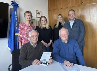 Autor Horst Rolland stellt gemeinsam mit Bruno Wagner (vorne v.l.) Heft 44 der Wissener Beiträge vor. Mit dabei v.l.: Walburga Heidemann, Alina Bendrien, Stephanie Hermann und Berno Neuhoff