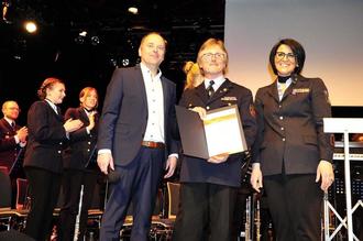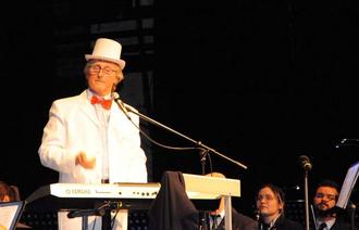 Bei dem Titel Swiss Lady wurde Christoph Becker stilecht mit weißem Jackett, roter Fliege und einem weißen Zylinder ausstaffiert. Christoph Becker erhielt im Rahmen des Konzertes eine besondere Ehrung. Durch den Geschäftsführer des Kreismusikverbandes Altenkirchen, Horst Steiger, wurde ihm die goldene Dirigentennadel mit Diamanten der Bundesvereinigung Deutscher Musikverbände verliehen. Die Vorsitzende des Vereins, Alexandra Reiffenrath, freute sich, dass es gelungen war, diese Ehrung geheim zu halten. Christoph Becker ist seit mehr als 30 Jahren Dirigent der Stadt- und Feuerwehrkapelle Wissen. Daneben ist er stellvertretender Landesstabführer im Landesfeuer-wehrverband. Zum Abschluss des Konzertes, das natürlich nicht ohne Zugabe zu Ende ging, gab es stehenden Applaus für die Aktiven. (kkö)