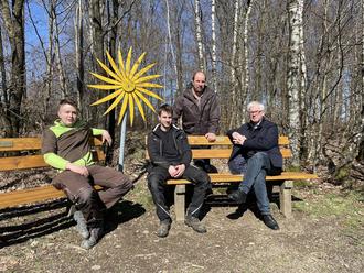 Endlich können die Bänke am Fähringer Feld wieder genutzt werden. Von links: Louis Büth, Hannes und Michael Schäfer mit Ortsbürgermeister Hubert Becher.