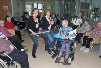 Sie nennen sich „Querflötenensemble Perlentöne“ und erfreuen regelmäßig ihre Mitmenschen bei verschiedenen Gelegenheiten. So auch jetzt wieder in der Osterzeit. Beate Weitz und Barbara Bauer hatten sich im Wissener Senioren- und Pflegeheim St. Hildegard angesagt und wurden dann sehnsüchtig erwartet. Zum Vortrag kamen auf einem der Flure gut 20 Stücke. Die Spannbreite reichte von Traum-Melodien wie „House of the Rising Sun“ oder „Londonderry“ über Stimmungslieder im Walzertakt bis zu Musik aus bekannten Disney-Filmen. Besonders gut kam an „Thank you for the Music“. Bei einigen Titeln klatschten oder schunkelten die Bewohner begeistert mit. Dies galt besonders bei dem Ohrwurm „Kein schöner Land...“. Der Applaus bewies, Beate Weitz und Barbara Bauer hatten die richtigen Töne und den Geschmack der Zuhörer/innen voll getroffen. Dies bestätigte auch Beate Rödder seitens der Heimleitung und bedankte sich bei den beiden Musikerinnen für die netten Ostergrüße. (bt)