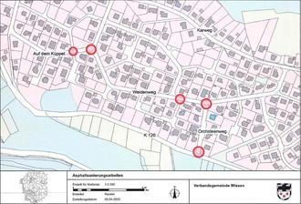 Im Neubaugebiet „Auf den Hüllen/ Auf dem Küppel“ in Schönstein werden ab Montag, 5. Mai bis max. Freitag, 9. Mai 2025 in den markierten Bereichen Asphalt-Sanierungsarbeiten durch die Firma Robert Schmidt, Müschenbach, durchgeführt. Hierbei wird der vorhandene Asphaltbelag abgefräst und anschließend wieder erneuert. Bedingt durch die Sanierungsarbeiten wird es zu kurzzeitigen Sperrungen der Sanierungsbereiche kommen, welche aber auf ein Minimum reduziert werden. Wir hoffen auf Verständnis für die Beeinträchtigungen.