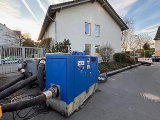 Mobile Pumpenaggregate mit Saug- und Druckleitungen sorgen dafür, das Wasser des Köttingsbachs umzupumpen.