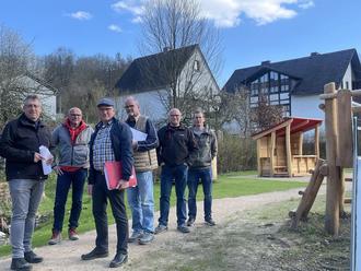 Was sich nach rund sechs Monaten Bauzeit auf dem Selbacher Spielplatz getan hat, wird die Herzen der Selbacher Mädchen und Jungen höher schlagen lassen. "Die Kinder können es kaum erwarten", freut sich der Erste Beigeordnete Michael Gotto im Verlauf der Bauausschusssitzung am Mittwoch, 19. April, die direkt vor Ort auf dem Spielplatz stattfand. Neben Andres Reifenrath vom Wissener Bauamt war auch Landschaftsarchitekt Martin Heinemann gekommen, um gemeinsam mit den Ausschussmitgliedern das erfreuliche Ergebnis der Umgestaltung unter die Lupe zu nehmen. Gerade frisch eingesät braucht der Platz noch rund drei Wochen Ruhe bis zur Eröffnung. Damit ist dann das zweite Highlight neben dem neu gestalteten und in unmittelbarer Nähe befindlichen Dorfplatz aus der Dorferneuerung entstanden.