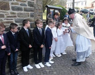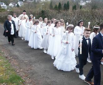 Der Samstag stand im Zeichen der Erstkommunion in Wissen und Schönstein. Da die katholische Pfarrkirche „Kreuzerhöhung“ zu Wissen aus den bekannten Gründen nicht zur Verfügung stand, musste man nach Schönstein ausweichen. Dort empfingen zunächst vier Mädchen und vierzehn Jungen ihre erste hl. Kommunion im Rahmen eines festlichen Gottesdienstes in der Kirche „St. Katharina“. Laut der Bibel hat Jesus beim letzten Abendmahl die Hostien auch mit seinen Jüngern geteilt. Sie sollen alljährlich an das Leben, den Tod und die Auferstehung des Herrn erinnern. Nach der Messe wurden die 18 Kinder von ihren Eltern auf dem Kirchplatz in Empfang genommen und nahmen viele Gratulationen entgegen. Zu Ehren der Hauptpersonen hatte sich auch die Stadt- und Feuerwehrkapelle Wissen eingefunden und stimmte einige zu dem besonderen Anlass passende Stücke an. Hier die Namen der Mädchen und Jungen: Samuel Becher, Hanna Cabbort, Maximilian Ersfeld, Louis Heidrich, Noah Müller, Pia Nilius, Mayla Reinscheid, Lennard und Niclas Selbach, Anton und Henri Schmidt, Liam und Sam Stieben, Lukas Schneider, Nikolaus Schulte, Moritz Vierschilling, Simon Ziegler und Mia Zimmermann. Direkt anschliessend wiederholte sich die Zeremonie mit 21 weiteren Kindern. Es waren Maria Abel, Lian Aeshu, Lucy Beer, Chiara Chatzidimitriou, Greta Emmerich, Katja Ferraro, Antonio und Ilary Franco, Kevin Froitzheim, Mia Gawenda, Dante Hartmann, Johanna Hoffmann, Jan Jakob, Nataniel Koldys, Leonie Mockenhaupt, Sophia Reifenrath, Mira Rödder, Tom Schmidt, Luna Stephan, Caroline Upmann und Clara Wirths. (bt)