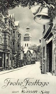 Vor etwa 70 Jahren verschickte der Wissener Kaufmann Karl-Heinz Seifer diese hübsche Ansichtskarte kurz vor Weihnachten an Kunden und Geschäftspartner. Sie zeigt den Blick aus der Rathausstraße über den Marktplatz hinweg bis zur katholischen Pfarrkirche. Seifer betrieb an der Ecke Mittelstraße/Marktplatz eine Lottoannahmestelle.