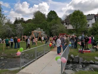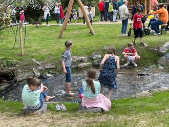 Die vielfältigen Möglichkeiten und verschiedenste Spielelemente sprechen nicht nur die Jüngsten an. Auch für Schulkinder ist der Erlebnis-Spielplatz spannend. "Wasser" ist dabei eines der zentralen Themen. Der Selbach, der abgeflacht und mit Sitzsteinen versehen zum buddeln und planschen einlädt, wurde optimal in das Erlebnis-Spielplatzkonzept eingebunden. Das allein ist schon ein Highlight und so wurde schon am Einweihungstag gebuddelt und gematscht was das Zeug hält. Ein weiteres Highlight stellt die Seilbahn dar, die sich die Kinder sehnlichst während der Dorfmoderation gewünscht hatten. Über das gesamte Spielplatzkonzept und weitere Einzelheiten wurde bereits berichtet.
