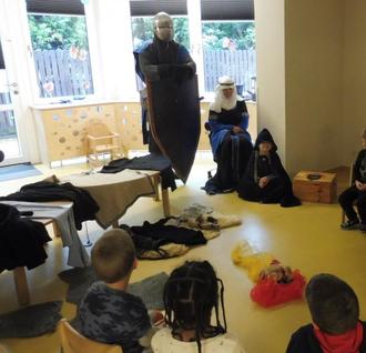 Als mit Ritter Torben ein echter Ritter mit seiner Familie zu Besuch in die Kita war, kamen die Kinder aus dem Staunen nicht heraus. Die drei haben einiges über das frühere Leben auf der Ritterburg erzählt, aber auch viel Material zum Anschauen und selbst anprobieren mitgebracht haben.