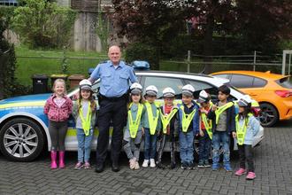 Zuerst besichtigten die 9 angehenden Schulkinder die Polizeiwache im Kreuztal. Herr Sander, der Jugendsachbearbeiter führte die Gruppe durch die Dienststelle. Angefangen im Aufenthaltsraum, wo die Kinder einen Einblick in das Arbeitsmaterial eines Streifenpolizisten erhielten. Herr Sander zeigte unter anderem die Kugelsichere Weste, die Handschellen, den Schlagstock, die Dienstwaffe und noch vieles mehr. Die Kinder durften Fragen zu den Materialien stellen und unterschiedliche Gegenstände auch in der Hand halten bzw. anprobieren.
