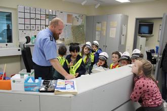 Nach einer Flut an Informationen und Anschauungsmaterialien, ging es weiter zu der Besichtigung und dem Probesitzen in einem Polizeiauto. Bei der Besichtigung der Gefängniszellen waren die Kinder sich einig: „Die sehen anders aus, als im Fernsehen!“ In der Schaltzentrale erhielten die Kinder Informationen über das Funken mit den Streifenpolizisten im Einsatz, über die vielen unterschiedlichen Monitore, über eingegangene Notrufe usw. Zum Abschluss der Führung beantwortete Herr Sander noch offene Fragen der Kinder.