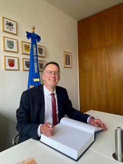 Innenminister Michael Ebling beim Eintrag in das Gästebuch der Stadt Wissen