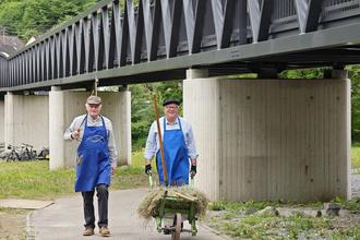 In bestem „Schönsteiner Platt“ zeigten Heimatforscher Bruno Wagner und sein Partner Thomas Marciniak längst Vergangenes auf. Die beiden erschienen in der damaligen „Tracht“ - helles Hemd und blaue Schürze - und mit einer Schubkarre, auf der das Heu lag, sowie einigen Utensilien für die Gartenarbeit. Wagner erläuterte, dass die Brücke, einen Steg zeigt bereits ein Gemälde von 1860, schon sehr lange den Weg zu den Gärten erleichtere. Die Querung der Sieg war für die Menschen, die im Walzwerk oder auf der Erzhütte Arbeit hatten, der kürzeste Weg.