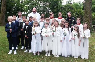 Hier die Namen: Ben Alfes, Anna Sophie Althaus, Lea Sophie Arnold, Lara Bennik, Moritz Blaeser, Louis Brück, Marie Sophie Christen, Anna Fuhr, Ida Liese Greb, Tom Kölzer, Lotte Leber, Ben Josef Leidig, Ellis Stausberg, Elia Wagner, Josh Willi Waltemate und Moritz Weib. Auf dem Kirchplatz wurden die Kommunikanten von ihren Anverwandten, darunter natürlich in erster Linie den Eltern begrüßt. Vertreter der Pfarrgemeinde steuerten Geschenktüten mit Kreuz und Weihwasser bei. In dem beigelegten Notizbuch können die Mädchen und Jungen ihre Gedanken und Empfindungen festhalten. Natürlich hatte es sich die Bergkapelle Birken-Honigsessen auch diesmal nicht nehmen lassen, zu Ehren der Kinder aufzuspielen. Direkt anschliessend ging es im Marschschritt und bei bester Laune zum traditionellen Waldfest in „Becher`s Birken“ am Ortsrand. Die Kommunionkinder und ihre Familien feierten den Tag noch zu Hause oder in einer geeigneten Gaststätte. (bt)