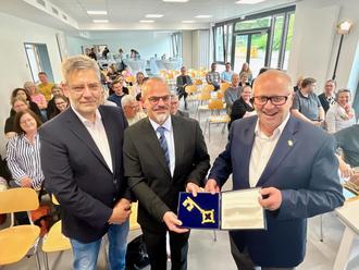Landrat Dr. Peter Enders (r.) übergab im Beisein von Regierungsschuldirektor Jörg Kurtscheidt (l.) von der ADD den symbolischen Schlüssel an Schulleiter Sebastian Holl.