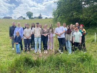Als Erinnerung an das Gemeinschaftsprojekt der ehemaligen Jahrgangsstufe 13 des Kopernikus-Gymnasiums im Stadtwald pflanzten die Schülerinnen und Schüler zwei Apfelbäume am Baumlehrpfad im Köttingsbachtal.
