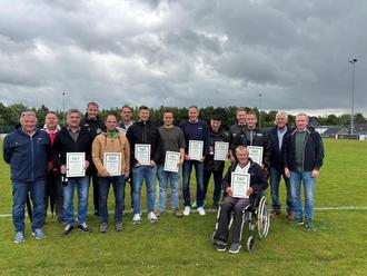 Wolfgang Weitz (ganz rechts) nahm mit Felix Schmidt (Fünfter von rechts, hinten) die Ehrungen am Pfingstfest beim TuS 09 Honigsessen vor.
