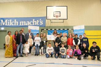 Die Siegerehrung fand in der Turnhalle vor der gesamten Grundschule mit Schuldirektor Lukas Fuchs, Bürgermeister Berno Neuhoff und Milag-Geschäftsführer André Nolden statt. „Milch ist ein besonderes Naturprodukt, das es auch in Zukunft geben soll.“, rief Rektor Fuchs den Kindern ins Gedächtnis. Nolden ergänzte: „Wir befinden uns hier in einer Region mit viel Grünland und dadurch an einem klassischen Standort der Milcherzeugung in Rheinland-Pfalz.“ Kein Wunder also, dass fast alle Kinder schon einmal auf einem Bauernhof zu Besuch waren und ihnen der Anblick von Kühen vertraut ist. Überraschend meldeten sich aber nur 4 der über 400 Grundschülerinnen und Grundschüler auf die Frage, wessen Familie einen Milchkuhbetrieb zuhause bewirtschaftet.