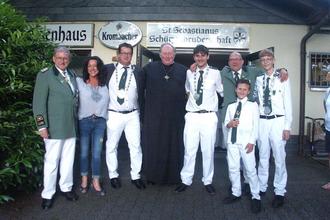 Schützenkönig Klaus Stangier und seine Königin Sabine Nell (2. von li.) nach der Proklamation vor dem Schönsteiner Schützenhaus. Dazu Jungschützenkönig Luam Koca, Bambiniprinz Maximilian Ersfeld und Schülerprinz Felix Kesseler (re.). Dazu gesellt haben sich Schützenmeister Mathias Groß (li.) und Präses Pastor Martin Kürten.