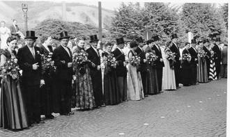 Vor 70 Jahren, im Sommer 1953, hieß der Wissener Schützenkönig Hermann Kempf. Er war Werkmeister im heimischen Walzwerk. Beim großen Festumzug begleitete ihn seine Ehefrau Anneliese. Dem Hofstaat gehörten an: Karl und Gertrud Arnold, Willi und Antonie Bender, Hermann und Frieda Linke, Hans und Hildegard Schmitz, Heinz und Hildegard „Hetti“ Krumm, Heinz und Margret Klappert, Manfred und Friedel Schmidt (sie wurden drei Jahre später selber Königspaar) sowie Albert und Gertrud Girresser. Vorsitzender des Wissener Schützenvereins war damals Franz Becker. Der Umzug startete an der Brücke Einhecke aus Richtung Schönstein und führte am Bahnhof vorbei zur Ortsmitte. Die Königsparade als Festhöhepunkt fand auf der Rathausstraße, Höhe Abzweigung Mittelstraße, statt. Für den Luftballonumzug hatte man sich den Weg von der Schützenwiese in der Brückhöfe über die provisorische Altstadtbrücke zur linken Siegseite ausgesucht. (bt)