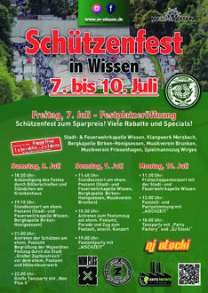 Das größte Schützenfest im nördlichen Rheinland-Pfalz öffnet in diesem Jahr den Festplatz wieder am Freitagabend: Der Wissener Schützenverein nimmt dies um 19:00 Uhr zum Anlass, das erste Bierfass anzuschlagen. In diesem Jahr erwarten die Besucher zur Festplatzeröffnung eine ganze Reihe von Ermäßigungen und Specials. Über eine Rabatt-Couponaktion haben alle Besucher die Gelegenheit, an allen teilnehmenden Fahr- und Reihengeschäften, sowie Imbissen, bis zu 50 € zu sparen. Das Motto für die diesjährige Festplatzeröffnung lautet: Freitag = Spartag! Die Couponbögen werden in der Festwoche über das Mitteilungsblatt der Verbandsgemeinde Wissen ausgegeben. Für Kurzentschlossene liegen die Couponbögen bei der Festplatzeröffnung im Kassenhaus auf dem Schützenplatz aus.