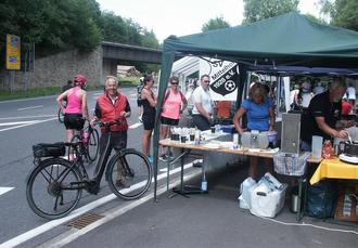Der Sportverein Mittelhof unterstützt von Beginn an die Aktion „Siegtal pur“. Und auch am Sonntag legte man sich wieder mächtig ins Zeug. An der Abzweigung K 127 von der B 62 hatte man ein Verpflegungszelt und einen Getränkestand aufgebaut. Direkt daneben brutzelten Würstchen auf einem großzügig bemessenen Grill. Auch die leckeren Mittelhofer Waffeln fanden reißenden Absatz bei den Radfahrern, die sich hier eine Pause gönnten. Alles in allem waren gut 20 Helferinnen und Helfern seitens des Sportvereins den ganzen Tag über im Einsatz. Weitere Haltepunkte lagen bei Obergüdeln, am Imbiss Zum Fuchsbau in Niederhövels und beim Angelsportverein im Wissener Frankenthal. (bt)