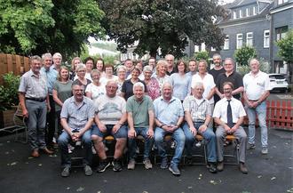 Nach dem Entgegennehmen der Urkunden und Anstecknadeln versammelten sich die Mehrfachblutspender vor einer Wissener Gaststätte. Vorne sitzen einige der Personen, die die meisten Termine absolviert haben (von links): Gerhard Pohl, Egon Bourtscheidt,Manfred Paul Kindler, Gerhard Demmer und Heinz Werner Brücher. Ganz rechts hat Carsten Henn Platz genommen. Er ist mit vielen anderen ehrenamtlichen Helferinnen und Helfern für das Blutspendewesen in der Rotkreuz-Bereitschaft Wissen zuständig.