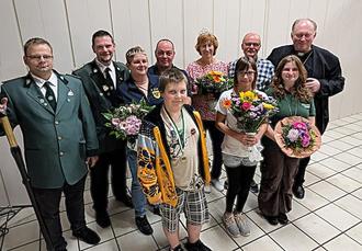 Auch in Selbach herrscht seit Sonntagabend große Freude über einen neuen Schützenkönig. Er heisst Klaus Bentebusch (hinten, 2. von re.) und ist ein altgedientes Mitglied der St. Hubertus-Schützenbruderschaft. Lea Seibert darf sich jetzt Jungschützenkönigin nennen, Leonie Hörner Schülerprinzessin und Michael Decker Bambiniprinz. Starker Beifall galt auch dem neuen Kaiser Frank Bönkendorf. Die Majestätsinsignien überreichte Präses Pastor Martin Kürten (re.), unterstützt von Schiessmeister Kevin Nau (li.) und Brudermeister Stephan Decker. (bt)