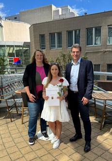 Klassenlehrerin Hanna Klein, Betriebswirtin Nina Hildebrandt, Schulleiter Burkhard Schneider