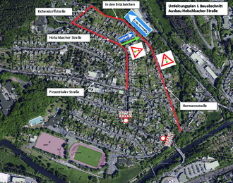 Am 24. Juli startet die Straßenbaumaßnahme Holschbacher Straße im ersten Bauabschnitt hinter dem Kreuzungsbereich zur Stadionstraße bis zum Abzweig Pirzenthaler Straße.
