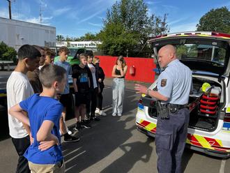 Als weitere Ausbildungsmöglichkeit wurde den Jugendlichen der Einblick in den Alltag als Polizist/-in ermöglicht. Hier konnte z.B. die Ausrüstung genauer unter die Lupe genommen oder im Streifenwagen Probe gesessen werden.