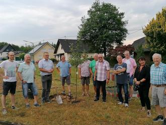 Bevor das Gespräch nach einer guten Stunde im Gasthof „Zur alten Kapelle“ fortgesetzt wurde, pflanzte Bürgermeister Neuhoff gemeinsam mit Ortsbürgermeister Wagner einen Apfelbaum, den er als Geschenk der Verbandsgemeinde mitgebracht hatte, am Eingang zum Sportplatz.