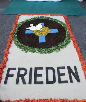 Vor der St. Anna-Kirche in Selbach wies ein Blumenteppich auf den Wunsch nach Frieden hin.