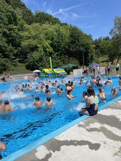 Am Samstag den 23.07.2022, lockte das schöne Wetter, bei freiem Eintritt, ca. 500 Gäste zum Sommerfest ins Freibad der Stadtwerke-Wissen GmbH. Ganz unter dem Motto Klettern, Hangeln, Springen konnten sich Klein und Groß bei der Pool-Party von 13-18 Uhr ausstoben und bei 25° C kühlem Nass zugleich erfrischen. Neben dem Planschbecken, welches von einem Sonnensegel beschattet wird, dem Kletter-Spielhaus mit Rutsche, dem Beachvolleyballfeld und den Waldsofas, lockte das Animationsteam der Firma „pool-events.de“ mit einer schwimmenden und 24m langen Hindernisbahn sowie einem aufblasbaren Katapult mit dem die Kinder in luftige Höhen befördert wurden. Des Weiteren gab es eine Wasserlaufmatte und einige lustige Spiele am und im Wasser des großen Mehrzweckbeckens. Über das gesamte Freibad hinweg wurde das Sommerfest mit Hits aus den aktuellen Charts beschallt. Für das leibliche Wohl mit günstigen Getränken und Speisen wurde durch die Gastronomie des Siegtalbades in gewohnter Qualität gesorgt. Zudem konnte man gegen eine kleine Spende, am Waffelstand der „Kinderkrebshilfe Gieleroth“ leckere Waffeln bekommen und diese im Schatten des extra aufgebauten Pavillons verzehren. Neben dem Kassen- Reinigungs- Küchen- Service- und dem Aufsichtspersonal, sorgten 2 Mitarbeiter vom DRK-Altenkirchen für die Zufriedenheit und die Sicherheit der Badegäste.