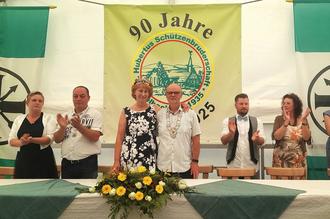 Schützenkönig Klaus I. (Benterbusch) liess sich am späten Samstagnachmittag unter Begleitung des Musikvereins Oberschwandorf an seiner Residenz abholen. Dieser Verein ist kein Unbekannter in Selbach. Schon 1980 machte er seine Aufwartung im Ort und gab auch in den Folgejahren mehrfach Proben seines musikalischen Könnens. Den großen Zapfenstreich führte der Musikverein Brunken als quasi „Hauskapelle“ der Bruderschaft unter Mitwirkung der Feuerwehren Schönstein und Wissen aus. Der Sonntag begann wie üblich mit der Kranzniederlegung am Ehrenmal für die Verstorbenen von Selbach und Fensdorf. Die traditionelle St. Anna-Prozession führte von der heimischen Kirche direkt ins Festzelt. Die Bruderschaft begleitete dabei das Allerheiligste in ihren schmucken Uniformen, den blanken Säbel an der Seite. Präses Pastor Martin Kürten ging bei dem Gottesdienst natürlich auch auf das Jubiläum ein: „Mit 90 Jahren ist noch lange nicht Schluss, wir blicken hoffnungsfroh auf die 100!“ Damit verbunden beglückwünschte der Geistliche die St. Hubertus-Schützenbruderschaft und wünschte ihr noch viele schöne Jahre. Nach dem Schlusslied „Großer Gott, wird loben Dich!“ bedankte sich Diakon Peter Vanderfuhr noch bei allen, die das Fest ermöglicht haben und lobte die Selbacher auch für den Straßenschmuck entlang des Festzugs. In der Mittagsstunde fand dann die Parade am Dorfplatz statt. Man marschierte an den Majestäten vorbei und erwies ihnen die gebührende Ehre. Vor dem Konzert des MV Brunken fanden noch einige Beförderungen statt. Demnach dürfen sich ab sofort Klaus Benterbusch und Jürgen Pöttgen mit „Oberleutnant“ ansprechen lassen. Bei Kevin Nau, Frank Bönkendorf und Peter Bönkendorf heisst es „Leutnant“. Der Brudermeister überreichte die Urkunden unter starkem Beifall. Zu den weiteren mitwirkenden Gruppierungen gehörten unter anderem die Schützenvereine Elkhausen/Katzwinkel, Wissen, Hamm, Wallmenroth und Struthütten, die Bruderschaft Schönstein und einige Selbacher Vereine. Gefeiert wurde dann noch kräftig bis in den späten Abend hinein, da lassen sich die Selbacher nichts vormachen. (bt)