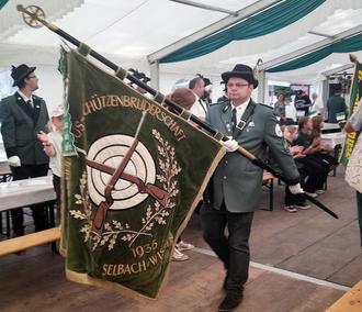 Fahne der gastgebende Schützenbruderschaft, getragen von Schießmeister Kevin Nau