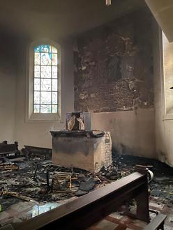 Der zerstörte Hochaltar in der Katholischen Kirche kurz nach der Brandstiftung