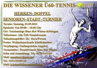 Am Samstag, den 2. September, werden auf der Anlage der Tennisfreunde Blau-Rot-Wissen in der Hachenburger Straße 339 zum zweiten Mal die „Wissener-Ü60-Tennis-Open“ ausgetragen. Anmeldungen hierzu sind nach wie vor möglich. Weitere Informationen können dem Einladungsplakat entnommen werden.