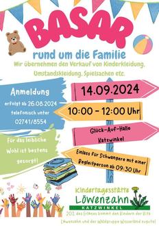 Die Kita Löwenzahn Katzwinkel, die Waldgruppe Wisserland und der dazugehörige Elternausschuss veranstalten am 14. September 2024 in der Glück-Auf-Halle in Katzwinkel von 10.00 bis 12.00 Uhr wieder einen „Basar rund um die Familie“.