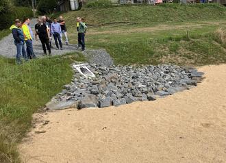 Günstige Umstände machten es möglich, ein Regenauffangbecken mit einem Fassungsvermögen von 103 Kubikmetern unterhalb der Bebauung an der Knappenstraße anzulegen, wo es sich gut in die Landschaft einfügt. Durch eine dicke Sandschicht und aufgrund optimaler Sickerungsfähigkeit des Bodens könne das Regenwasser von dort "dosiert in den Bröhlbach" abgeleitet werden, erklärt Becher die spannende Angelegenheit.